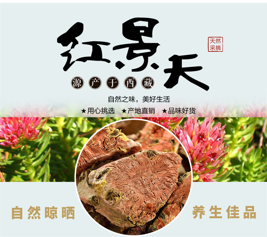 紅景天,中藥名。為景天科大花紅景天的干燥根和根莖,秋季花莖凋枯后采挖,除去粗皮,洗凈,曬干。紅景天的根莖呈圓柱形,粗短,略彎曲,少數(shù)有分枝,長5~500px,直徑2.9~112.5px。表面棕色或褐色,粗糙有褶皺,剝開外表皮有一層膜質黃色表皮且粉紅色花紋,宿存部分老花莖,花莖基部被三角形或卵形膜質鱗片,節(jié)間不規(guī)則,斷面粉紅色至紫紅色,有一環(huán)紋,質輕,疏松。主根呈圓柱形,粗短,長約500px,上部直徑約37.5px,側根長10~750px;斷面橙紅色或紫紅色,有時具裂隙。氣芳香,味微苦澀、后甜。
